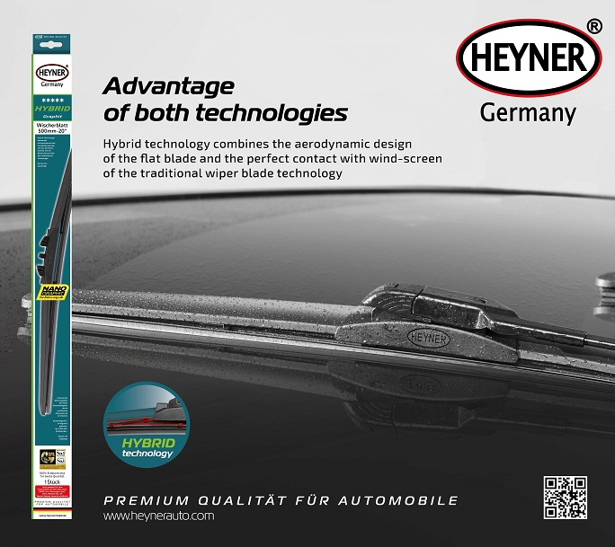 Gạt mưa ô tô Heyner sử dụng hỗn hợp đồng thời công nghệ khí động học của Flachbalkenwischer và công nghệ truyền thống giúp lưỡi gạt tiếp xúc hoàn hảo với mặt kính ô tô.