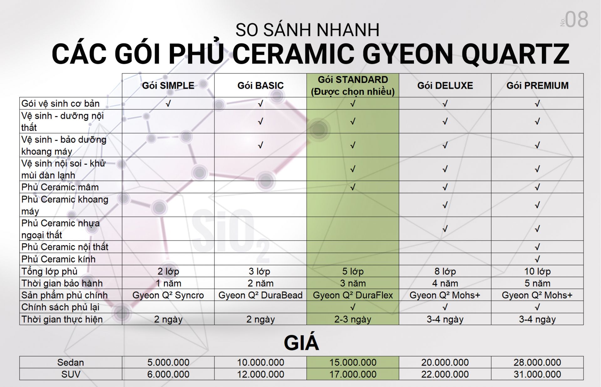 Tại thành phố Hồ Chí Minh có rất nhiều địa điểm cung cấp dịch vụ phủ Ceramic xe hơi. Tuy nhiên, các loại phủ Ceramic xe hơi trên thị trường có nguồn gốc từ SiO2, các hãng sản xuất có thay đổi nguyên tố khác nhau nhằm tạo ra các tính năng phù hợp cho các khí hậu nhất định. Từ đó, điều kiện liên kết bề mặt sẽ thay đổi dẫn đến chất lượng lớp phủ cũng thay đổi.