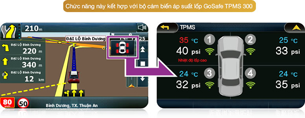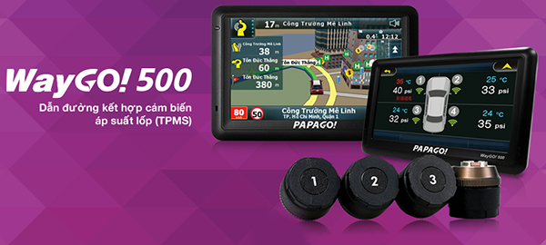 VietMap S1 giúp tìm đường mới dẫn đường hợp lý và chính xác. PAPAGO theo dõi trạng thái lốp xe mọi lúc với cảm biến áp suất được gắn trên từng bánh và chịu trách nhiệm gửi thông tin về áp suất, nhiệt độ của 4 lốp xe hiển thị trực tiếp trên màn hình của thiết bị WayGO! 500.